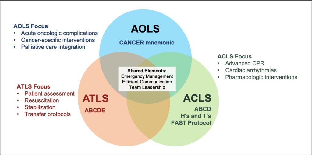 While ATLS® focuses on trauma stabilization and ACLS® on cardiac life support, neither addresses the unique needs of cancer patients in emergency settings. That’s where AOLS® comes in. Built around the C-A-N-C-E-R® mnemonic, AOLS® equips healthcare teams to handle oncologic emergencies, initiate cancer-specific interventions, and integrate palliative care when appropriate. Together, these three frameworks provide a more complete, responsive approach to managing critically ill patients — especially in hospitals, emergency departments, and ICUs.